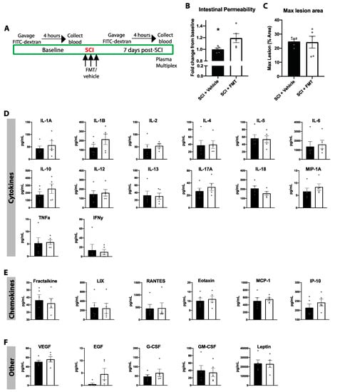 Increased intestinal barrier permeability has previously been shown in mice 7 days following a thoracic SCI, which can allow bacterial and other matter to translocate across the impaired epithelial tight junctions [4,36]. To test whether a cervical contusion SCI in rats also triggers an increase in intestinal permeability, rats were gavaged with FITC-dextran and the concentration of FITC was measured in blood 4 h later (Figure 9A). This test was performed before SCI and again 7 days later and expressed as a fold change from baseline to account for individual differences. SCI alone did not alter intestinal permeability, however FMT from anxious donors increased intestinal permeability by nearly 20% compared to baseline (SCI + Vehicle vs. SCI + FMT p = 0.043) (Figure 9B). This increased intestinal permeability was not due to differences in lesion size (Figure 9C). To determine whether differences in intestinal permeability between groups was associated with changes in systemic inflammation at the same time, plasma cytokines/chemokines were analyzed in these rats 7 days post injury. There was no difference between FMT or vehicle controls in plasma concentrations of cytokines, chemokines, or other growth factors, glycoproteins and hormones (Figure 9D–F).