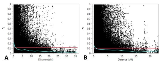 Linkage disequilibrium plots for (A) genome A; (B) genome B. The locally estimated scatterplot smoothing (LOESS) curve is represented in blue. The red line represents the mean value for the square of marker correlations (r2).