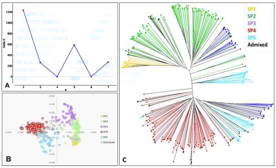 Analysis of population structure was performed according to the distance of LD decay using only SNP markers showing less than 25% of missing data, minor allele frequencies higher than 10%, and PIC values higher than 0.3. A total of 1695 markers were used. The highest value for ΔK was observed for K = 2, followed by K = 5 (Figure 2A). In the first case, the Bayesian clustering method used the Evanno test [32] to separate the genotypes by their origin (landraces vs. modern cultivars). Considering a membership coefficient of q > 0.6, the first group comprised 201 genotypes, 19 of them modern cultivars (9%) and 182 (91%) landraces. The second group included 160 modern cultivars. Finally, 26 genotypes remained as admixed (one landrace and 25 modern cultivars). When K = 5, the genotypes were structured according to their origin, showing a geographical pattern. In this case, q > 0.5 was established as a threshold for considering a genotype within a subpopulation (SP).