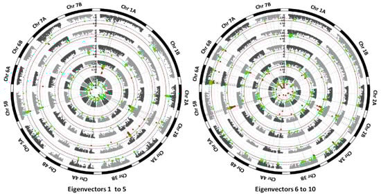 EigenGWAS was conducted using the top ten eigenvectors resulting from the PCoA obtained for the whole collection of genotypes, including landraces and modern cultivars. The largest eigenvalue was 3600.4, explaining 11.3% of the genetic variation, whereas the 10th eigenvalue was 408.0, explaining 1.3% of the genetic variation. The top ten eigenvalues accounted for 32.3% of the genetic variation, which indicates the complexity of the population structure of this durum wheat collection. A total of 1575 marker–trait associations (MTAs) were reported for the top ten eigenvectors using a moderate threshold of −log10 p = 3.0. Based on the LD decay for a maximum distance of 1 cM, a highly significant FDR threshold at p < 0.05 was established for −log10 p = 4.6. Following this approach, 250 MTAs were significant (Figure 3, Supplementary Table S2, Supplementary Figure S2). The number of MTAs per eigenvector ranged from 57 for eigenvector 2 to 304 for eigenvector 10. Chromosome 2B showed the maximum number of associations (279), whereas chromosome 4B showed the lowest (10). The mean percentage of variance explained (r2) per MTA ranged from 0.003 to 0.108, with an average of 0.034.