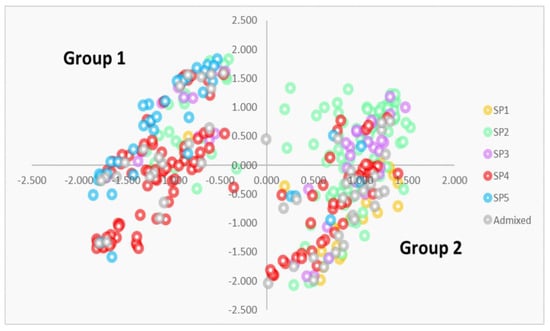 The PCoA separated two clear groups: group 1, on the left of the Y-axis, included 173 genotypes (mainly modern cultivars (79%)), whereas group 2, on the right of the Y-axis, included 214 genotypes, of which 69% corresponded to landraces. By SPs, those represented mainly by landraces (SP 1, SP 2 and SP 3) were mostly included in group 2 (95%, 77%, and 63%, respectively), whereas SPs represented mainly by modern cultivars (SP 4 and SP 5), were mostly included in group 1 (63% and 85%, respectively). All north American cultivars from SP 5 were located within group 1. Most of the landraces from the northern Mediterranean included in SP 2 were also represented in group 1.