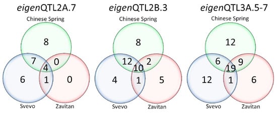 From 133 gene models within the three QTL hotspots, 33 (25%) were common for the three genomes, 25 (19%) were common between ‘Chinese Spring’ and ‘Svevo’, 11 (8%) were common between ‘Chinese Spring’ and ‘Zavitan’, and 3 (2%) were in common between ‘Svevo’ and ‘Zavitan’. Finally, 46% of the gene models were unique for the different genomes.