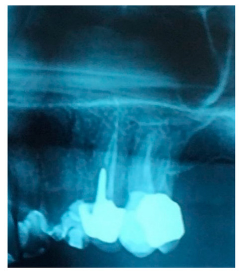 A 52-year-old osteoporotic patient came to our observation. The patient reported the first left maxillary molar painful during chewing. The clinical examination showed tooth and crown mobility and secondary decay under the crown. Radiographic examination showed an osteolytic lesion below the distal root due to an incongruous root canal treatment (Figure 1).