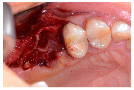 Intraoperative view of the oral mucosa at one month post tooth extraction. Soft tissues appeared to be completely healed with no signs of bone exposition, considered as a clear sign of BRONJ.