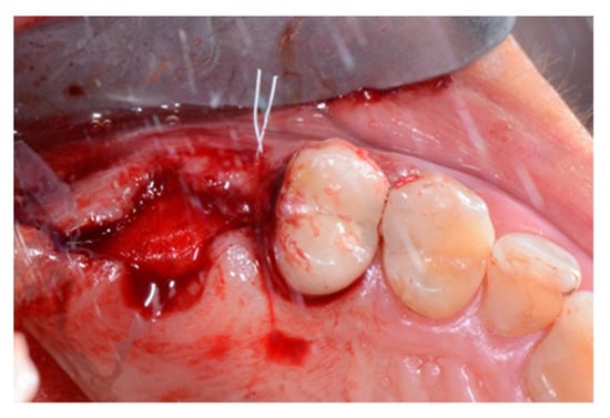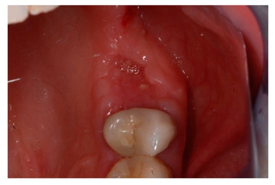 Vestibular intraoperative view of the oral mucosa 10 days after tooth extraction and socket preservation. Soft tissues appeared completely healed with no signs of bone exposition, considered as a clear sign of bisphosphonate-related osteonecrosis of the jaw (BRONJ).