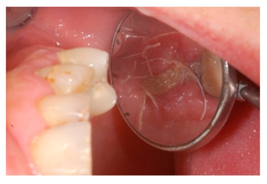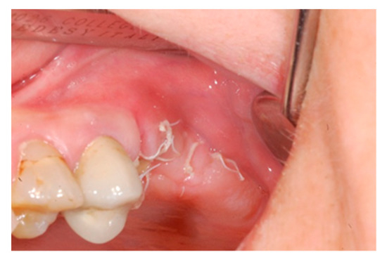 Ten days after the extraction and socket preservation, the patient was recalled for the suture removal. The clinical observation showed the occurrence of physiological healing without any complication (Figure 6 and Figure 7).
