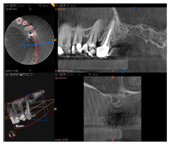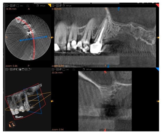 Five months after the extraction, a cone-beam computed tomography (CBCT) was also performed to design the implant insertion. The radiological examination showed bone volume preservation of the post-extraction site and no signs of osteonecrosis (Figure 9 and Figure 10).