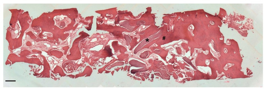 Two-dimensional (2D) reconstruction of the bone sample after staining with Hematoxylin and Eosin staining solution (magnification 25×, scale bar 400 μm). Bone trabeculae are dark-pink colored (#), whereas graft material appears light-pink colored (*).