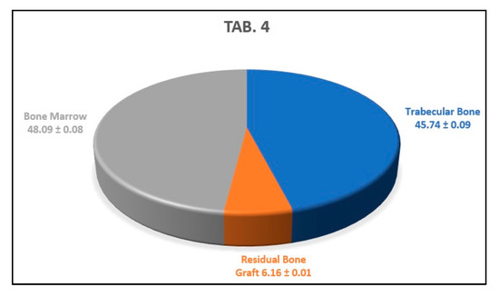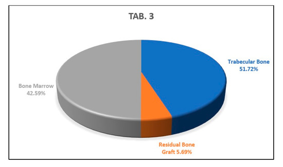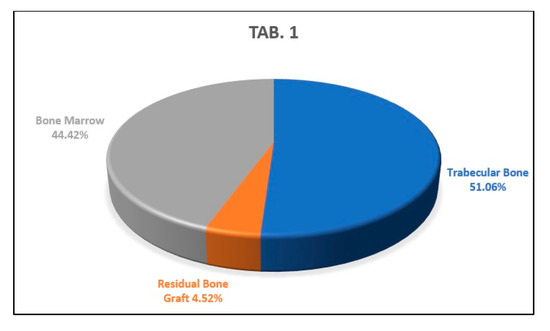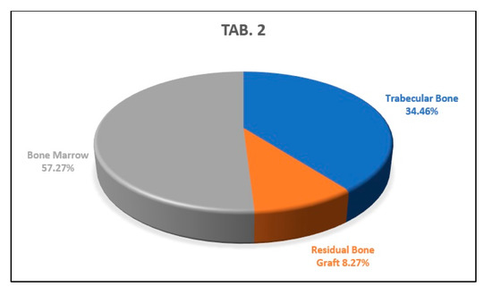 This graph shows the average percentages of newly formed bone, bone marrow, and biomaterial granules of the analyzed sample.