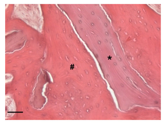 Detail of the bone sample stained with Masson’s trichrome staining solution (magnification 100×, scale bar 100 μm). The image shows the presence of lamellar bone indicating the complete bone remodeling (#).