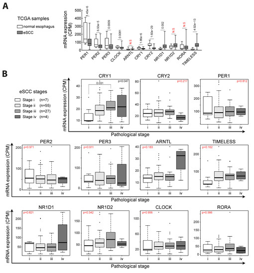 The following are available online at https://www.mdpi.com/article/10.3390/biology10040266/s1, Figure S1: Expression of clock-related genes in human eSCC samples depending on tumor stages. Figure S2: Expression of clock-related genes in human eSCC samples regarding N tumor pathological stage.