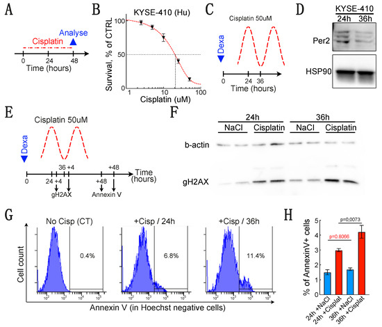 A low PER2 expression is associated to higher sensitivity to cisplatin-induced apoptosis. (A) Experimental design. (B) KYSE-410 survival measured using MTS assay 48 h after cisplatin treatment. The red sigmoid curve is a guide for the eye. Data are represented as mean +/− SEM (n = 5). (C) Experimental design to treat KYSE-410 when PER2 expression is high or low (24 or 36 h after synchronization respectively). (D) Western blot showing the expression of PER2 24 or 36 h after synchronization. (E) Schematic representation of the cisplatin treatment timeline and the time-points selected to collect the samples for DNA damage (γH2AX) evaluation and apoptosis (annexin V) measurement. (F) Western blot showing the expression of γH2AX after a 4-h cisplatin treatment either 24 or 36 h post-synchronization. Cells were either treated with vehicle alone (NaCl) or with 50 μM cisplatin. (G) Representative histogram showing the proportion of Hoechst-/Annexin V KYSE-410 cells measured by flow cytometry 48 h after the end of the cisplatin treatment. Cells were either not treated (NaCl = vehicle) or treated for 4 h with 50 μM cisplatin 24 or 36 h after synchronization. (H) Histogram summarizing the proportion of Hoechst-/Annexin V KYSE-410 cells measured 48h after the end of the cisplatin treatment. Data are represented as mean +/− SEM (n = 8). p-values were calculated using a two-way ANOVA followed by Sidak’s post hoc test. Fixed effect: Time/p = 0.0110; Cisplatin/p < 0.0001; Time x Cisplatin/p = 0.0527.