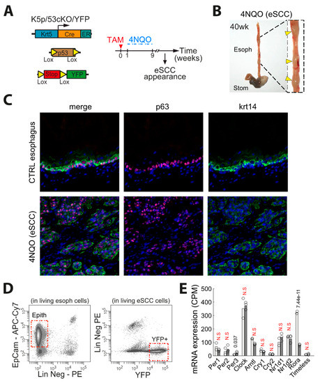 In order to determine whether the pattern of clock related genes in biopsies of human eSCC would be affected by their contamination with non-epithelial cells, we have investigated clock genes in a mouse model of eSCC. To this end, we used a model of chemically-induced esophageal cancer based on the addition of 4-NQO (4-Nitroquinoline 1-oxide) in the drinking water. We treated K5CreER:p53fl/fl:RosaYFP (K5:p53:YFP) mice with tamoxifen to remove p53 and turn on the YFP fluorescent reporter in esophageal cells (Figure 5A). We treated 8 weeks-old K5:p53:YFP mice with 4-NQO over 8 weeks and then followed them over time until they developed tumors (Figure 5B). We could dissect individual tumors from K5:p53:YFP esophagus and digested these to isolate tumor epithelial cells by flow cytometry. We verified the histology of the primary tumors prior to sequencing. These tumors were characterized by classical eSCC markers p63 and Krt14 (Figure 5C). FACS analysis confirmed the expression of YFP by the tumor cells, allowing us to sort pure YFP+ tumor epithelial cells and get rid of the contamination with lineage negative cells (CD45+ leukocytes, CD31+ endothelial cells and CD140a+ fibroblasts) (Figure 5D). We profiled YFP+ eSCC epithelial cells by RNAseq and compared them to FACS sorted EpCam+ control esophageal epithelial cells (Figure 5D). We found 3,492 transcripts significantly deregulated in cancer cells (Log2 Fold of change >1 and FDR < 0.01). We focused our analysis on clock related genes and found no difference except for PER3, which was upregulated (LFC = 1.21) in cancer cells compared to normal cells and Rora, which appeared downregulated (LFC= −2.07) in cancer cells compared to control esophageal cells (Figure 5E).