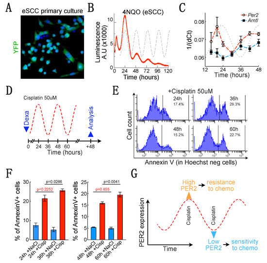 A low PER2 expression is associated to a higher sensitivity to cisplatin in mouse eSCC epithelial cells. (A) Endogenous YFP fluorescence in primary culture of 4-NQO-induced eSCC epithelial cells. (B) Real time monitoring of luciferase activity in primary culture of 4-NQO-induced eSCC epithelial cells. (C) PER2 and Arntl expression on the 4-NQO induced eSCC epithelial cells measured by qPCR for 48 h after dexamethasone-induced synchronization. (D) Experimental design to treat 4-NQO-induced eSCC epithelial cells when PER2 expression is high or low (24 or 36 h after dexamethasone-induced synchronization). (E) Representative histogram showing the proportion of Hoechst-/Annexin V 4-NQO-induced eSCC epithelial cells measured by flow cytometry 48 h after the end of the cisplatin treatment. Cells were either not treated (NaCl = vehicle) or treated for 4 h with 50 μM cisplatin 24, 36, 48 or 60 h after synchronization. (F) Histogram summarizing the proportion of Hoechst-/Annexin V+ 4-NQO-induced eSCC epithelial cells measured 48 h after the end of the cisplatin treatment. Data are represented as mean +/− SEM. p-values were calculated using a two-way ANOVA followed by Sidak’s post hoc test. First cycle (n = 8). Fixed effect: Time/p = 0.3788; Cisplatin/p < 0.0001; Time x Cisplatin/p = 0.0067. Second cycle (n = 5). Fixed effect: Time/p = 0.0231; Cisplatin/p < 0.0001; Time x Cisplatin/p = 0.0231. (G) Scheme depicting our main observations in esophageal cancer cells.