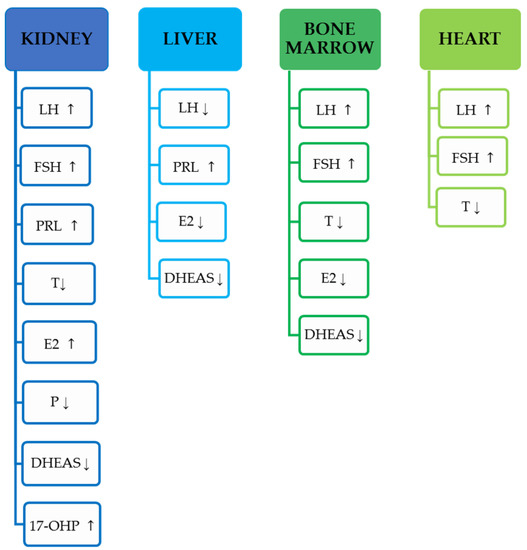 The final stage of kidney failure frequently leads to moderate or severe sexual dysfunction [8]. The imbalance of sex hormones is frequently diagnosed in dialyzed patients and mostly a decrease in the concentrations of T, DHT, DHEA, DHEAS are noticed, as well as elevated levels of FSH, LH or PRL. According to the latest data, approximately 50–70% of male and female patients with chronic kidney disease (CKD) suffer from sexual dysfunction [8]. Renal transplantation is one of the kidney replacement treatments. In contrast to transplantation of other solid organs, renal transplantation is not a life-saving treatment, but the one which successfully prolongs life expectancy and improves the quality of life, thanks to which, patients may return to their professional and social roles, including sexual activity [1]. Chronic kidney disease results in dysfunction of the hypothalamic-pituitary-gonadal axis both in males and females. The severity of the endocrine and reproductive dysfunction seems to be proportional to the degree of kidney impairment [9]. Renal transplant recipients are patients who most frequently suffered from uremia for many years before transplantation. The latter is the highly deteriorating state of the organism, mostly affecting reproductive function, as only 10% of dialyzed patients can get pregnant. Among the patients with CKD, the impairment of the hypothalamic-pituitary-gonadal axis is frequently diagnosed [7,10]. The disturbances in the hypothalamic-pituitary-gonadal axis are manifested differently, depending on sex. Almost 70% of CKD women suffer from disrupted ovarian cycles, shortened luteal phase, anovulatory cycles or premature menopause for approximately 4.5 years [11]. Among men, disorders in the hypothalamic-pituitary-gonadal axis are usually reflected in erectile dysfunction, lowered libido, improper spermato- and steroidogenesis, most of which result from hypotestosteronemia [12]. It is believed that a lowered concentration of circulating sex steroidal hormones does not only result in clinical hypogonadism but may be additionally associated with a higher risk of premature cardiovascular disease development and graft loss as it plays a significant role in pathogenesis and the progression of kidney failure [9,13,14].