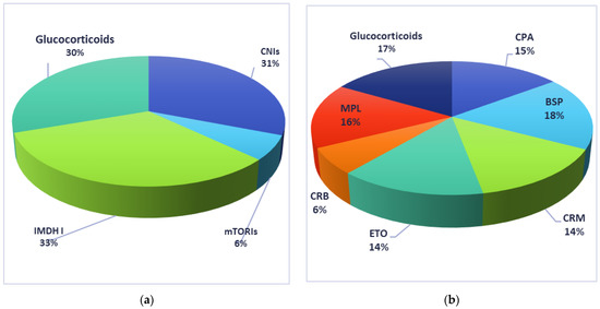 Immunosuppressive drugs used by recipients included in the current manuscript: (a) solid-organs recipients; (b) bone-marrow recipients. CNIs: calcineurin inhibitors; mTORIs: mTOR inhibitors; IMDH I: inhibitors for inosine monophosphate dehydrogenase; CPA: cyclophosphamide, BSP: busulphan; CRM: carmustine; ETO: etopside; CRB: cytarabine; MPL: melphalan.