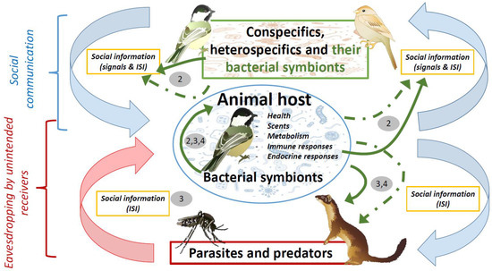 We have reviewed the state of the art on the role of microbial symbionts on animal communication, paying special attention to chemical communication with conspecifics, and to the interactions between their hosts with parasites and predators. These two issues converge on the possibility that parasites and predators use volatiles of bacterial origin to detect and select their victims, highlighting the possibility that it occurs because, independently of their function, volatiles of symbiotic bacterial origin are in fact host signals or inadvertent social information that can be eavesdropped on by conspecifics and heterospecifics (see Figure 1).