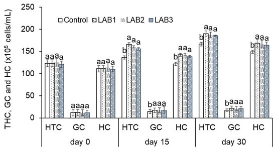 In general, the results showed an increase of THC, GC, and HC of shrimp during the time of the experiment. The experimental results indicated that THC, GC, and HC of shrimp in the LAB1, LAB2, and LAB3 treatments were quite high and significantly different in comparison to those in the control treatment. After 15 days of the experiment, the highest THC, GC, and HC were 166.1, 17.4, and 142.8 × 105 cells/mL, respectively, in the LAB1 treatment. Similarly, THC, GC, and HC of shrimp continuously increased and reached 190.3, 21.8, and 168.6 × 105 cells/mL, respectively, in LAB1 treatment after 30 days of the experiment. Meanwhile, THC, GC, and HC of shrimp in NC treatment were 136.3, 14.5, and 121.9 × 105 cells/mL after 15 days of the experiment, and 166.5, 17.7, and 148.9 × 105 cells/mL after 30 days of the experiment. It could be concluded that using L. plantarum, L. fermentum, and p. pentosaceus has the potential to enhance the innate immunity of white leg shrimp (P. vannamei), especially L. plantarum.
