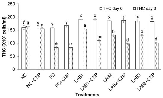 Total hemocytes count. The treatments with different letters (x, y or a, b …) were significantly different (p < 0.05). Error bar indicated standard error (SE) with three replications.