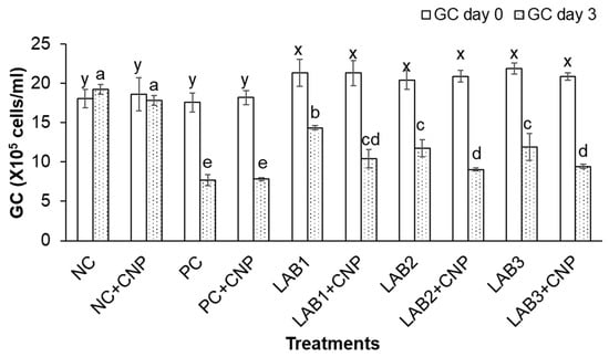 Granulocytes count. The treatments with different letters (x, y or a, b …) were significantly different (p < 0.05). Error bar indicated standard error (SE) with three replications.