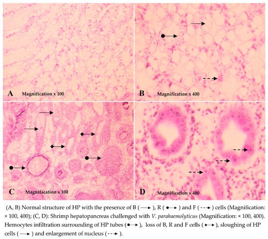 Samples of hepatopancreas (HP) were extracted from the shrimp and fixed in Davidson’s AFA with a ratio of 1 hepatopancreas:10 Davidson’s AFA in 48 h (volume/volume). The HP samples were then placed in 70% alcohol as described by [16] before they were dehydrated by 70%, 80%, 95%, and 100% ethyl alcohol, and xylene. The HP samples were then cast with paraffin and sectioned into pieces with 5 μm thickness. The sectioned samples were put in 45–50 °C water before mounting on glass slides to make microscopic samples. The slides were stained with Haematoxylin và Eosin (H&E) before observation under a microscope.