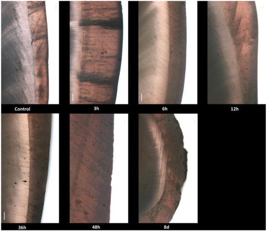 No histological changes in the enamel structure and morphology were identified in the control group. Normal histological features of tooth enamel were also observed at 3, 6, 12 and 36 h after exposure, respectively. At 48 h after exposure, the enamel surface showed multifocal and irregular areas with distinctive roughness. At 8 days after exposure, multiple, very deep and delimited cavities with elevated margins were revealed in the enamel structure (Figure 1).