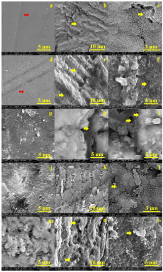 The structural alterations occur in dentine after 12 h of treatment (Figure 2i). Several depressions alter the observed surface especially in the center of the observation field and on the left side of the image. It seems to appear some boulder formations on the surface ranging from 1 to 3.5 μm. The degradation continues by increasing of the depressions featuring mineral loss tendency after 48 h of treatment. The mineral loss makes more visible the collagen fibers network which surrounds the boulder formations which are more visible. The profound decay of dentin is observed after 8 days (Figure 2o). The mineral loss is profound in the surface which embosses the collagen fibers network; the most representative boulder formations are indicated by a yellow arrow.