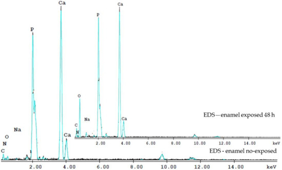 The EDS spectra evidence the Ca and P contents of the enamel no-exposed and exposed 48 h to the laser irradiation. The Ca/P ratio at 48 h was lower than that of no-exposed enamel.