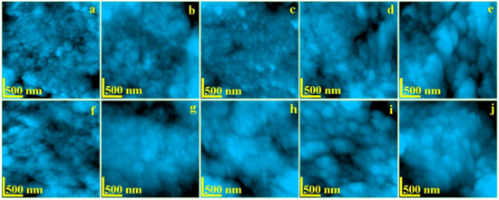 AFM topographic images of: Enamel—(a) no exposure, (b) exposed 6 h, (c) exposed 12 h, (d) exposed 48 h, and (e) exposed 8 days; Dentine—(f) no exposure, (g) exposed 6 h, (h) exposed 12 h, (i) exposed 48 h, and (j) exposed 8 days. Scanned area 2.5 × 2.5 μm.