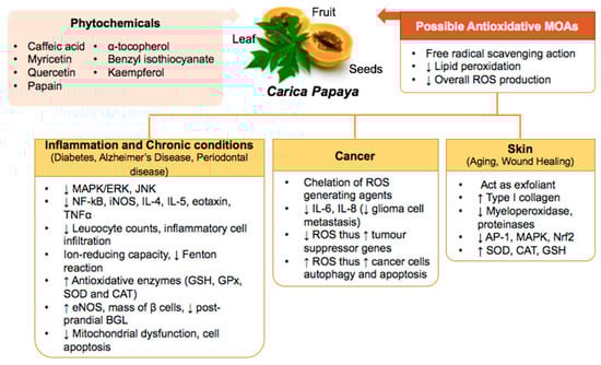 All literature was retrieved from databases (PubMed, Semantic Scholar, Web of Science, WorldWideScience, and Embase) using search terms, including “Carica papaya”, “inflammation”, “cancer”, “Alzheimer’s Disease”, “diabetes”, “aging”, “wound healing” and “oxidative stress”. Literatures published from 2000 to 2020, investigating the benefits of the Carica papaya plant towards various conditions, were included. Literatures that were not related to oxidative stress mechanisms were excluded. Literatures selected were categorized based on related conditions including inflammation, cancer, skin aging, wound healing, diabetes, periodontal diseases, and Alzheimer’s disease (AD). The mechanisms of action of the Carica papaya towards each condition were also presented in tables in the respective sections.