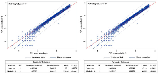 Linear regression analysis after excluding an outlier case (where the PSA value was over 10 ng/mL) for modality A showed that the regression line met the axis at 1.133 (slope of 1), and the parameter estimate was 1.160 (standard error (SE): 0.003). Furthermore, based on modality A, except for an outlier case (where the PSA value exceeded 4 ng/mL), the point where the regression line met the axis was 0.879 (slope of 1), and the parameter estimate was 1.178 (SE 0.004) (Figure 1). In addition, the values predicted for modality A compared to modality B are shown in Table 3. If modality B PSA yielded a value of 0.2 ng/mL, the expected value for modality A was 0.258 ng/mL (95% CI: 0.255–0.260); the expected value at 3 ng/mL (modality B) was 2.507 ng/mL (modality A, 95% CI: 2.476–2.539); and at 4 ng/mL (modality B), the expected value was 3.192 ng/mL (modality A, 95% CI: 3.150–3.235) (Table 3).