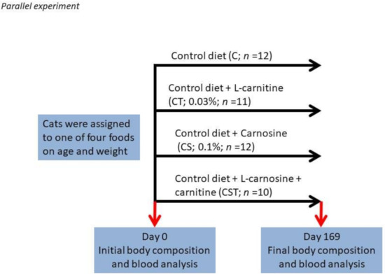 In cell cultures, carnosine upregulated the mitochondrial respiratory and cellular ATP content of astrocyte cultures in the recovery period following an ischemic injury (oxygen-glucose deprivation) [14]. The health benefits of carnosine, in particular its effects on energy metabolism, have been demonstrated [15]. To our knowledge, reports of carnosine supplementation in cat food and their subsequent effects on body composition and/or circulating levels of inflammatory markers has not been reported. The nutritional requirements of cats do not include carnitine or carnosine as essential nutrients.