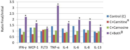 Dietary influence on circulating cytokine concentration. IFN-γ—Intrerferon gamma; MCP-1—Monocyte Chemoattractant Protein-1; Flt-3L—Fms-like tyrosine kinase 3 ligand; TNFα—Tissue Necrosis Factor α; IL-4—Interleukin 4; IL-6—Interleukin 6; IL-8—Interleukin 8; IL-13—Interleukin 13; € Treatments are as follows: Control (C)—a traditional adult cat food; C+Carnitine—control food supplemented with 300 mg/kg L-carnitine; C+Carnosine—control food supplemented with 1000 mg/kg carnosine; * Means are increased from initial values (p < 0.05); Θ The carnitine + carnosine treatment increased cytokine concentration (p < 0.05); α The carnitine treatment reduced cytokine concentration (p < 0.05).