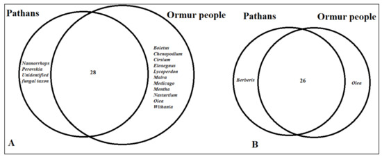 Ethnobotanical taxa and their uses were compared between the two community groups through Venn diagrams, which were drafted using free software (http://bioinformatics.psb.ugent.be/webtools/Venn/ accessed on 22 March 2021). Moreover, for national data comparison, a detailed literature survey on the ethnobotany of WFPs of Pakistan was also conducted [18,19,20,42,43,44,45,46,47,48].