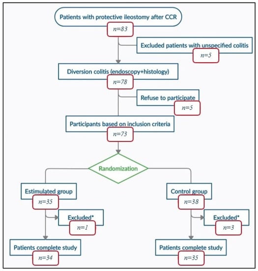 The sample size was calculated according to the diversion colitis endoscopic and histological findings published in previous studies [16,24]. Assumed reduction in macroscopic and microscopic pathological findings was 50% (100–50%). With a loss adjustment of 15%, it was necessary to have 30 patients per group. We recruited 34 patients for the stimulated group and 35 patients for the control group for a statistical level of 95% and a power of 0.8.