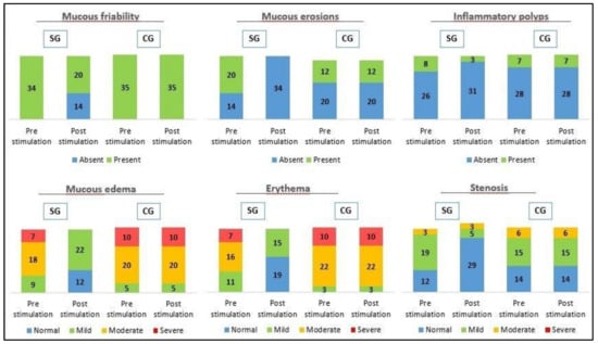 Macroscopic findings by endoscopy before and after stimulation in CG and SG in diversion colitis. A statistically significant decrease in endoscopic pathological findings (mucosal friability, mucous erosions, polyps, edema, erythema and stenosis) were observed in SG, with a p < 0.001.
