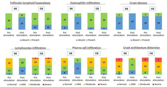 The effects of probiotic stimulation were depicted in Figure 3. A homogeneous distribution between SG and CG was observed in the pre-stimulation phase. Lymphoid follicular hyperplasia was present in 71.4% of patients in CG (n = 25) and 88.2% in SG (n = 30) and was maintained after stimulation with probiotics in 71.4% in CG compared to 23.5% in SG (n = 8), being absent in 76.5% in SG (n = 26), with a p < 0.001 and Phi and V Cramer coefficient of 0.683. In the short-term follow-up lymphoid follicular hyperplasia had already disappeared after reconstructive surgery in both groups. Eosinophils were present in 85.7% in CG (n = 30) and 76.5% in SG (n = 26) and it was maintained after stimulation with probiotics in 85.7% in CG compared to 20.6% in SG (n = 7), being absent in 79.4% in SG (n = 27), with a p < 0.001 and Phi and V Cramer coefficient of 0.518. In the short-term follow-up eosinophils were only present in 2.9% after reconstructive surgery in both groups, with a p = 0.182. Crypt abscesses were present in 20% in CG (n = 7) and 20.6% in SG patients (n = 7) and it was maintained after stimulation with probiotics in 20% in CG, less when compared to SG in which were absent in 100% of patients (n = 34), with a p < 0.001 and Phi and V Cramer coefficient of 0.666. In the short-term follow-up crypt abscesses had already disappeared after reconstructive surgery in both groups. Lymphocytic infiltration of the lamina propria was present in 94.3% of patients in CG (n = 33) and 91.2% in SG (n = 31). The distribution of CG according to endoscopic severity was 17 mild (48.6%), 14 moderate (40%) and 2 severe (5.7%) while in SG it was 11 mild (32.4%) and 20 moderate (58.8%). Lymphocytic infiltration of the lamina propria was maintained in 94.3% in CG with the same distribution after stimulation with probiotics, compared to SG with 18 mild (52.9%) and absence in 16 patients (47.1%), with a p < 0.001 and Phi and V coefficient of Cramer 0.692. In the short-term follow-up lymphocytic infiltration of the lamina propria had disappeared in 85.7% in CG (n = 30) and 100% in SG (n = 34) after reconstructive surgery, persisting in a mild form in 14.3% in CG (n = 5), with a p = 0.004 and Phi and V Cramer coefficient of 0.442. Plasma cell infiltration was present in 94.3% in CG (n = 33) and 76.5% in SG (n = 26). The distribution of CG according to endoscopic severity was 14 mild (40%) and 19 moderate (54.3%). However, it was observed in SG 11 mild (32.4%) and 15 moderate (44.1%). Plasma cell infiltration was maintained with the same distribution after stimulation with probiotics in 94.3% in CG compared to SG with 9 mild (26.5%) being absent in 25 in SG (73.5%), with a p < 0.001 and Phi and V Cramer coefficient 0.771. In the short-term follow-up plasma cell infiltration had disappeared in 94.3% in CG (n = 33) and 97.1% in SG (n = 33) after reconstructive surgery, persisting mild infiltration by lymphocytes in 5.7% in CG (n = 2) and 2.9% in SG (n = 1), with a p = 0.190. Destructuring of the crypt architecture was present in 100% in CG (n = 35) and 91.2% in SG (n = 31). The distribution of CG according to endoscopic severity was 8 mild (22.9%), 19 moderate (54.3%) and 8 severe (22.9%), however in SG 4 mild (11.8%), 20 moderate (58.8%) and 7 severe (20.6%) was observed. Destructuring of the crypt architecture was maintained, after stimulation with probiotics, in 100% in CG with the same distribution, compared to SG with 23 mild (67.6%), 2 moderate (5.9%) and absence in 9 patients (26.5%), with a p < 0.001 and Phi and V Cramer coefficient of 0.911. In the short-term follow-up destructuring of the crypt architecture had disappeared in 85.7% in CG (n = 30) and 100% in SG (n = 34), persisting mild alteration of the architecture in 14.3% in CG (n = 5) after reconstructive surgery, with a p = 0.002 and Phi and V Cramer coefficient of 0.471.