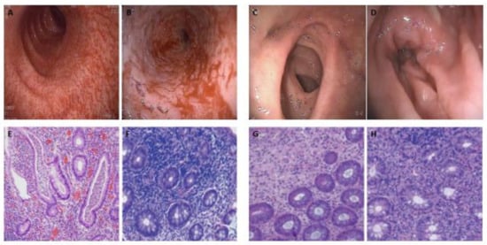 The endoscopic findings described are: friable mucosa, edema, erythema, appearance of polyps, ulcers, stenosis and histological findings such as lymphoid follicular hyperplasia, infiltration of the lamina propria by lymphocytes, eosinophils, the appearance of plasma cells, architectural disruption, and the appearance of crypt abscesses [15,21].