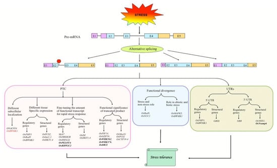 Although global transcriptome analyses have identified plenty of abiotic stress-induced alternatively spliced transcripts, the functional significance of only some of them in adaptive stress responses has been demonstrated. The protein-coding genes can be either structural or regulatory, with the proteins encoded by structural genes having structural or functional properties in the cell—while those encoded by regulatory genes regulate the expression of structural genes [69]. Based on our extensive literature survey, we found that rice genes encoding regulatory proteins are more likely to undergo AS under various abiotic stresses, and more importantly, the functional significance of AS events in these genes has been analyzed (Figure 1; Table S1 [70,71,72,73,74,75,76,77,78,79,80,81,82,83,84,85,86,87,88,89,90,91,92,93,94,95]). It follows that AS is an elegant and energy-saving mechanism particularly targeting those genes which can, in turn, regulate a diverse set of downstream structural genes for activating the adaptive responses to stresses. However, some structural genes of rice also undergo stress-induced AS, which has important implications for rice abiotic stress tolerance. AS in abiotic-stress-responsive regulatory and structural genes of rice acts through diverse mechanisms as illustrated below.