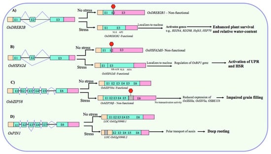 By producing truncated nonfunctional proteins, AS through timely IR or PTC serves as a potential way of fine-tuning the amount of stress-responsive functional protein in the cell during abiotic stress. For example, drought and heat stress-induced AS regulates the cellular levels of OsDREB2B, which has a nonfunctional (OsDREB2B1) and a functional transcript form (OsDREB2B2). The nonfunctional and functional forms are predominant under non-stress and stress conditions, respectively. Under drought, the functional form operates to increase drought tolerance by enhancing the plant survival rate and relative water content (Figure 2A) [70]. Similarly, hypoxia-induced myb7 has an unspliced (with two retained introns) and a spliced form, and the ratio of these isoforms changes under aerobic and hypoxic conditions. The spliced form increases the expression of myb-related genes in hypoxic roots [71]. Likewise, the heat shock factor gene OsHSFA2d constitutively produces the inactive forms (OsHSFA2dII and OsHSFA2dIII) under non-stress conditions, whereas under heat stress, it generates the transcriptionally active form (OsHSFA2dI), which participates in heat stress response by regulating the unfolded protein response (UPR) (Figure 2B) [72].