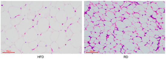 Histomorphological changes in the perirenal adipose tissue of dieting rabbits. Histomorphological image of the perirenal adipose tissue from the high-fat diet (HFD) and restricted diet (RD) rabbits.