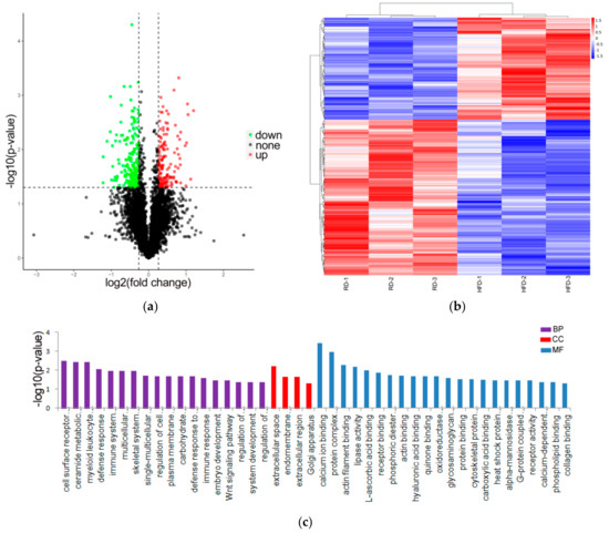 Identification and analysis of differentially expressed (DE) proteins. (a) Volcano map of DE proteins screened the HFD (n = 3) and RD (n = 3) groups and was built based on log2(fold change) and -log10(p-value). (b) Hierarchical clustering analysis of the DE proteins in the samples of HFD (n = 3) and RD (n = 3) (red represents upregulated proteins, and blue represents downregulated proteins). (c) The results from the DE proteins were applied to a GO analysis, only showing the significantly enriched GO terms (p < 0.05). High-fat diet: HFD and restricted diet: RD.