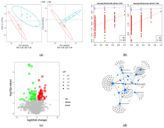 Identification and analysis of DE metabolites. (a) Partial least squares discriminant analysis (PLS-DA) of all metabolites in the samples of HFD (n = 6) and RD (n = 6) groups in the positive (left) and negative (right) ion modes. (b) The permutation test. (c) Volcano map of the DE metabolites screened between the HFD (n = 6) and RD (n = 6) groups and was built based on log2(fold change) and -log10(p-value). (d) The metabolite–metabolite interaction network was built by using the MetaboAnalyst database. High-fat diet: HFD and restricted diet: RD.