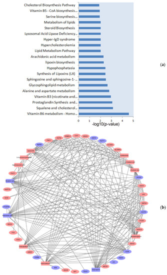 To further analyze the significantly changed pathways in both proteomics and metabolomics, we integrated the analysis of the DE proteins and DE metabolites in the Integrated Molecular Pathway Level Analysis (IMPaLA) database (http://impala.molgen.mpg.de/, accessed on 16 May 2020). The IMPaLA database combines information from multiple databases, such as Reactome (http://www.reactome.org, accessed on 16 May 2020), Wikipathways (https://www.wikipathways.org/index.php/WikiPathways, accessed on 16 May 2020), Kyoto Encyclopedia of Eenes and Eenomes (KEGG; https://www.kegg.jp/, accessed on 16 May 2020), and HumanCyc (https://humancyc.org/, accessed on 16 May 2020) databases.