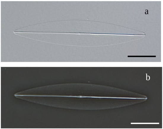 (a): LM-DIC (Light microscopy Differential interference contrast) image of cleaned frustules of Haslea silbo clone K-1285. (b): LM-PC (Light microscopy Phase-contrast) image of cleaned frustules of Haslea silbo clone K-1285. Scale bar 10 µm.