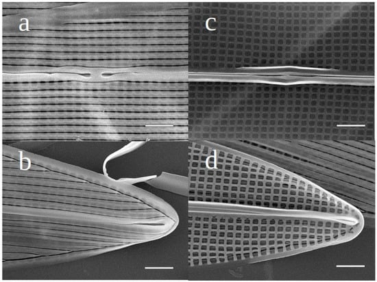 (a) SEM image of Haslea silbo clone K-1285, external view of the central raphe ending and longitudinal slits. (b) SEM image of Haslea silbo clone K-1285, external view of the straight apical raphe ending. (c) SEM image of Haslea silbo clone K-1285, internal view of the central ending of the raphe, notice the squarish areolae and the thin central bar. (d) SEM image of Haslea silbo clone K-1285, internal view of the apices with the straight apical ending of the raphe (Figure 9). Scale bar 1 μm.