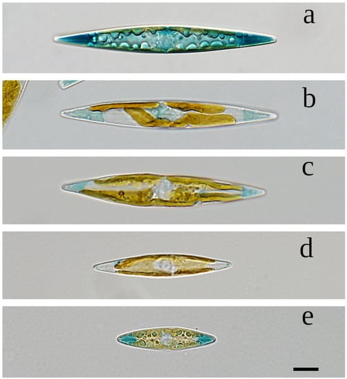 Reduction in cell size of Haslea silbo clone K-1285 between July 2009 and January 2012. Scale bar 10 µm. (a) July 2009. (b) February 2010. (c) November 2010. (d) August 2011. (e) January 2012.