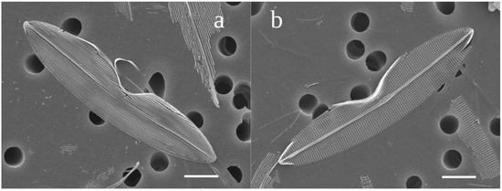 (a): Scanning electron microscopy (SEM) image of complete valves of Haslea silbo clone K-1285 in external view. (b): SEM image of complete valves of Haslea silbo clone K-1285 in internal view. Scale bars 10 µm.