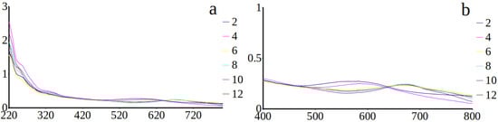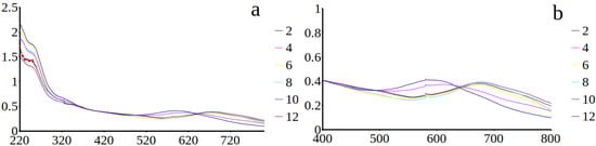 UV–visible spectra obtained on intracellular (Figure 8a,b) and extracellular (Figure 9a,b) forms of the blue pigment produced by H. silbo were very similar and all displayed an isobestic point in the visible region of the spectrum at ca. 640 nm (Figure 9a,b). The position of the isobestic point at 640 nm is identical to what was already observed on the pigments of H. provincialis [21].