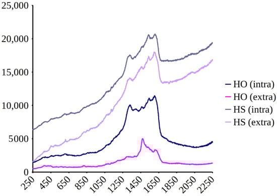 Comparison of the in vitro Raman spectra at 514.5 nm recorded on purified blue pigments of Haslea ostrearia (HO) and Haslea silbo (HS), intracellular form (intra) and extracellular form (extra). X-axis = Wavenumber (cm−1). Y-axis=Raman Intensity (arbitrary units).